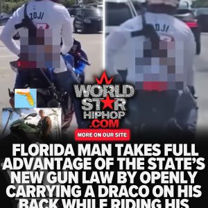 Florida really different… A man was seen casually riding his motorcycle with a Draco strapped to his back, fresh off the state’s new open carry law. 👀 Residents say it feels like GTA has jumped into real life. Law or not, many are questioning if this is safe or asking for trouble.