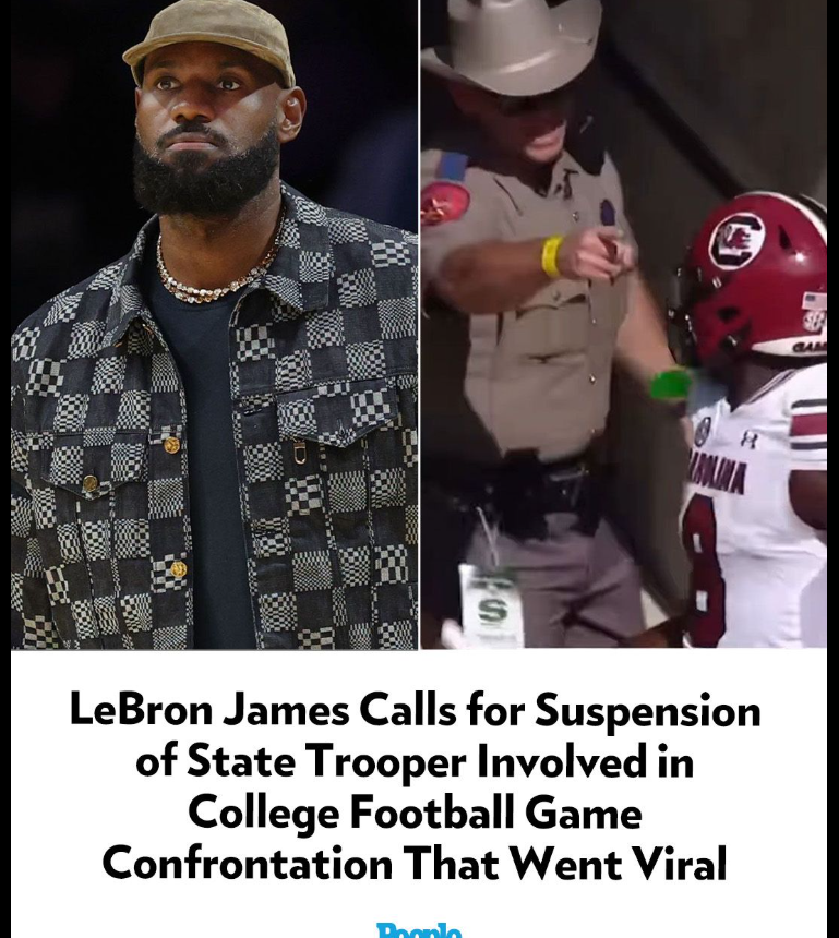 Allen J. Schaben/Los Angeles Times; ESPN A Texas state trooper was sent home for the day following an incident during a Texas A&M football game on Nov. 15 A video that went viral shows a trooper seemingly bumping into and then scolding two South Carolina football players The moment prompted Los Angeles Lakers star LeBron James to call for the trooper’s suspension in a post he shared on X A Texas state trooper was sent home for the day after a moment between the trooper and several college football players went viral. The incident occurred during a game between Texas A&M and South Carolina at Kyle Field on Saturday, Nov. 15, according to ESPN. South Carolina players Nyck Harbor and Oscar Adaway III were walking through a stadium tunnel after Harbor caught an 80-yard touchdown pass when a Texas state trooper appeared to bump into Adaway.