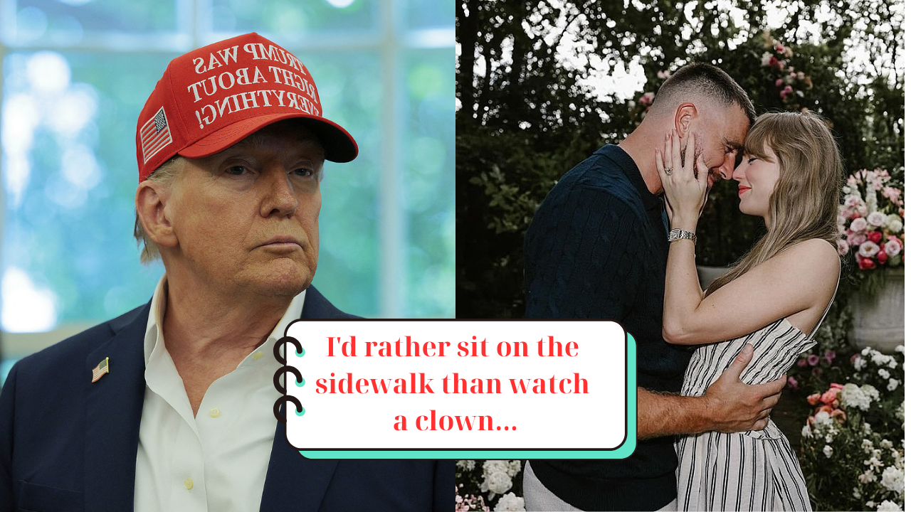 The so-called “wedding of the century” between Taylor Swift and Travis Kelce was supposed to be a fairy tale moment, the kind of event that dominates headlines for weeks and lives in pop culture history forever. Yet, in classic fashion, Donald Trump has stolen the spotlight with a remark so blunt and dismissive that it has divided the internet in half. Asked during a brief press stop what he thought of Taylor Swift’s big day, Trump smirked and fired off: “I’d rather sit on the sidewalk than watch a clown pretending to be royalty.”