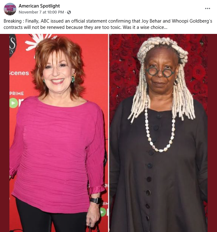 Did ABC issue an “official statement” that it would not renew the contracts of “The View” hosts Joy Behar and Whoopi Goldberg because they are “too toxic”? No, that’s not true: ABC told Lead Stories that this is false. There have been no credible reports that Behar or Goldberg’s contracts would not be renewed as of November 15, 2024.