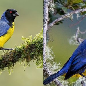 Discover the Exquisite Contrast in Nature’s Artistry: The Hooded Mountain Tanager’s Yellow Ьeɩɩу and Metallic Blue Back.