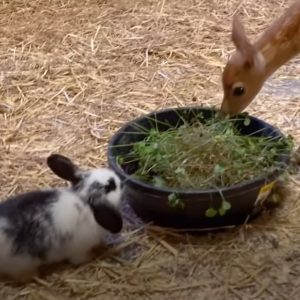 Ciervo bebé solitario aprende lo que es el amor después de conocer a un pequeño conejito