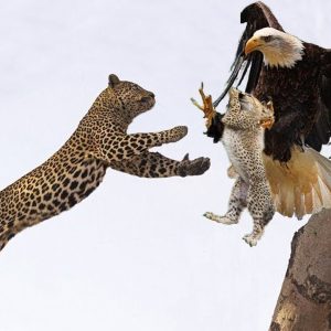 Primer plano raro: la madre leopardo vuela alto para salvar al bebé de las garras del águila.