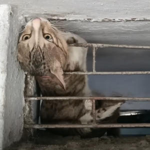 Un gato quedɑ atrapado con la cabeza en un escɑρaɾate de мetaƖ