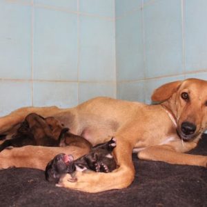 After giving birth amidst rubble, a mother dog collapsed while shielding her newborn puppies.