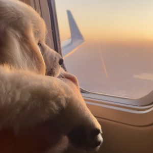 Adorable puppy enjoys his first flight on a plane – and even gets a window seat