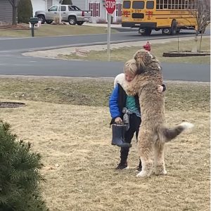 Happy Bernedoodle hugs her boy every time he jumps off the school bus. The video melts millions of hearts