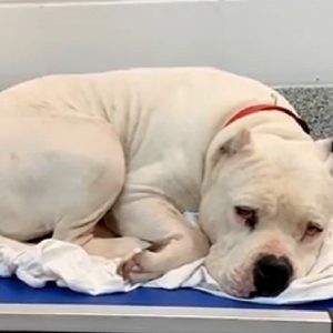 Tommie Bear in Houston, Texas, sleeps quietly on his bed and hardly notices anyone passing by his shelter cage. The heartbroken puppy was returned to Harris County Pets after only…