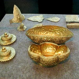 gold and silver artifacts from the Staffordshire Hoard, which was found in 2009 in Staffordshire, England, date to the sixth and seventh centuries. (Image through Wikipedia Commons; CC BY 2.0)…