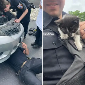 Una situación aterradora para un gatito atrapado lo llevó a un final muy feliz, luego de que uno de los oficiales lo adoptara y lo salvó de un motor de…