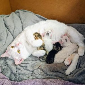 En un día soleado, una sorprendente escena tuvo lugar cuando una hermosa gata blanca hizo su aparición frente a la puerta de una familia. No venía sola, sino acompañada de sus adorables gatitos. Con gran fortuna, esta familia decidió acoger a la madre y sus pequeños, brindándoles un hogar seguro y amoroso. A partir de ahora, estos felinos no tendrán que enfrentarse a la intemperie ni sufrirán de hambre o sed. – sallnews