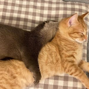 Nutria cariñosa abraza a su mejor amigo gatito cada noche antes de acostarse