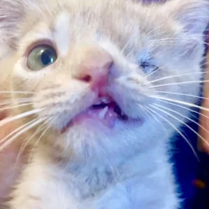 A pesar de tener deformidades faciales, este pequeño gato siempre muestra una sonrisa feliz en su rostro.