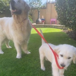 Adorable cachorro Golden Retriever asume el papel de guía para un perro ciego de 12 años
