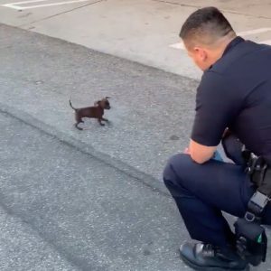 Un cachorro abandonado busca desesperadamente un hogar amoroso, tirando de los corazones de los policías y rogando persistentemente por adopción.