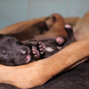 Después de dar a luz entre escombros, una perra se derrumbó mientras protegía a sus cachorros recién nacidos.