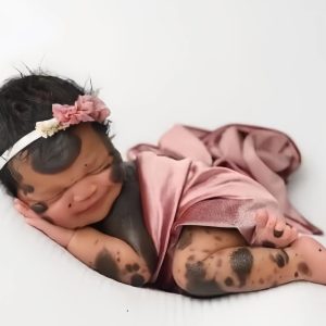 “La beauté d’un petit ange : un bébé né avec de belles taches de naissance noires sur son visage et son corps” q.