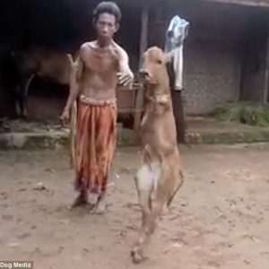 Ha aparecido en línea un video impactante de una vaca bebé caminando sobre dos patas como una persona. el clip, que se cree que fue filmado en Indonesia, muestra a…