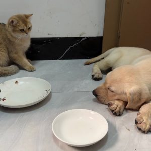 el gatito está muy enojado 💢❗️ ¡el codicioso labrador retriever le robó la comida al gatito!