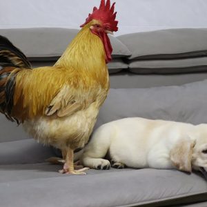 ¿Cómo reacciona un labrador retriever ante un gallo grande por primera vez?