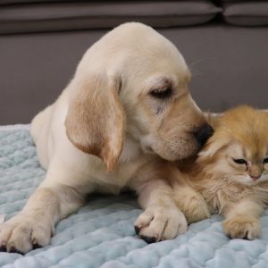 ¡Labrador retriever intentó hacerse amigo de los gatitos! Los perros y los gatitos son lindos para dormir juntos.