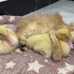 ¿Cómo reacciona el golden retriever cuando los patitos ocupan la cama del gatito golden retriever?