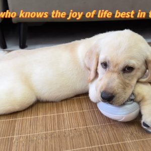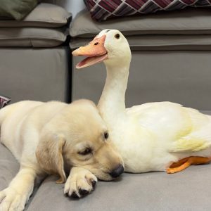 Labrador retriever abraza al patito y duerme muy lindo. La reacción del cachorro al patito