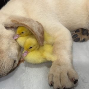 Labrador retriever abraza al patito y duerme muy lindo. La reacción del cachorro al patito