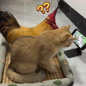 el gallo se conmovio mucho despues de ver el video del gatito sacando a los pollitos a comer!👍