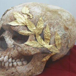 The skull of a 2500- year-old athlete with a golden wreath of laurel branches still attached to it